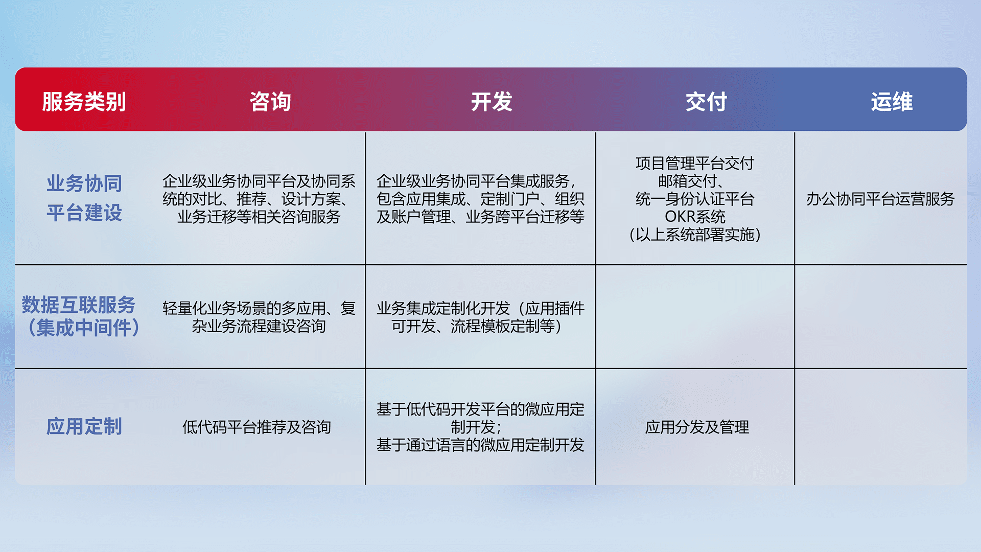 针对钉钉、、企微、、、、IDaas等平台级产品提供产品的规划、、、方案、、、交付、、、定制化开发等服务,,,,实现如统一协同办公、、、、智能客户服务、、混合会议管理、、、智能数据查询、、、、等业务场景,,实现数字化转型。。。