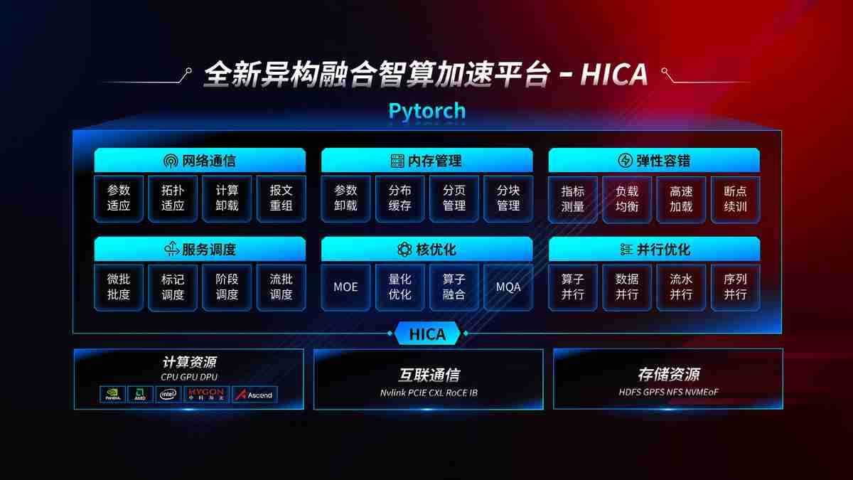 通过自研的服务层、、、中间适配层、、、、以及调度编排算法,,,采用数据并行、、、模型并行等多种并行方式,,把并行计算任务进行有效的分解,,使其分别由相应的软件栈和算力资源来承接。。。当GPU资源变化,,HICA可以实时动态调度计算子任务并调整模型拓扑和架构,,,,以充分聚合各种算力资源。。