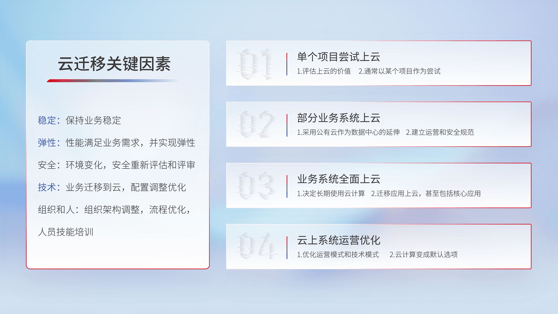 结合实际业务,,,从规划设计、、、、云平台选型、、、云原生改造、、、数据迁移、、集成交付,,迁移全过程为客户识别最佳上云路径,,,做好风险识别管理,,设计网络架构、、、身份权限、、、安全审计合规、、、操作审计、、、日志审计、、监控告警策略、、多站点容灾设计等,,对云上基础设施进行整体规划,,,提升IT治理水平,,以满足弹性、、、、高可用、、、高性能的需求。。。。